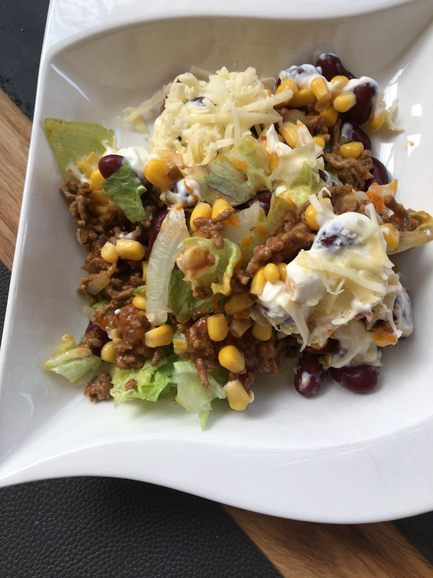 Hackfleisch mit Salz, Pfeffer, Paprikapulver und/oder Tacogewürzmischung würzen und anbraten. Leicht abkühlen lassen und dann auf dem Salat verteilen.