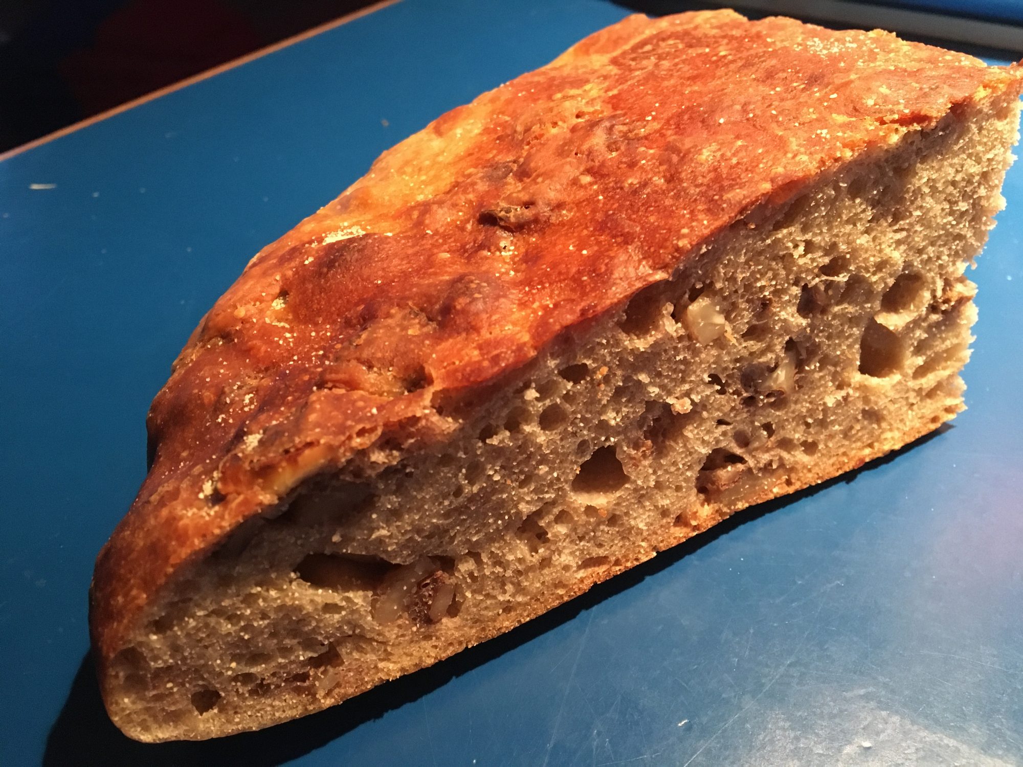 Walnüsse mit dem Messerrücken grob hacken und mit Dinkel- und Roggenmehl, Trockenhefe und Salz in eine Schüssel geben.